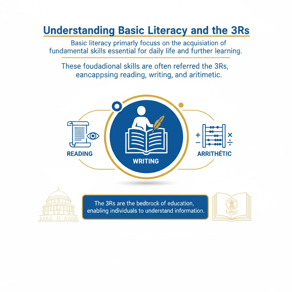 Basic literacy focuses majorly on the acquisition of 3Rs, i.e., reading, writing and arithmetic skills. - social-issues | UPSC Learning
